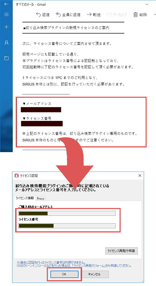 絞り込み検索プラグインはSIRIUS本体とは別に、ライセンス認証を行う必要があります。絞り込み検索プラグインの初回起動時は下記のようなライセンス認証画面が表示されますので、商品購入時に送付された案内のメールをご参照の上でライセンス番号の認証を行って下さい。こちらで入力するライセンス番号は、SIRIUS本体のライセンス番号とは別のものになります。本プラグイン購入時のメールに記載されているライセンス番号を使用してください。案内メールの件名は、「【SIRIUS】絞り込み検索プラグインのライセンス番号のご案内」となっていま...
