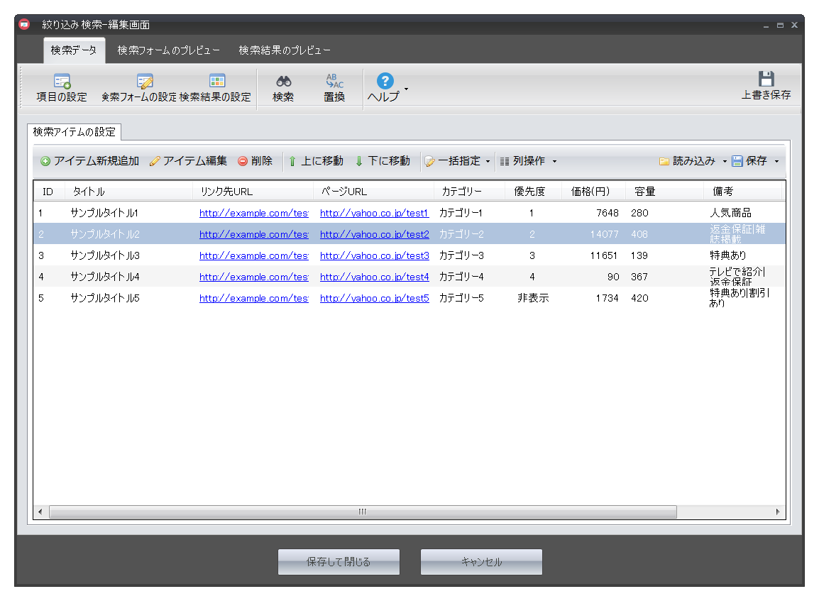 主にこの画面で『検索項目』や『検索アイテム』を追加・編集したり、検索アイテムのタイトルや評価、価格などの各種設定を行います。