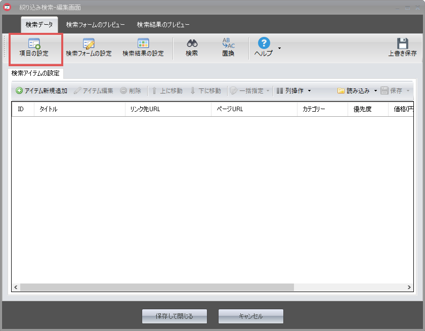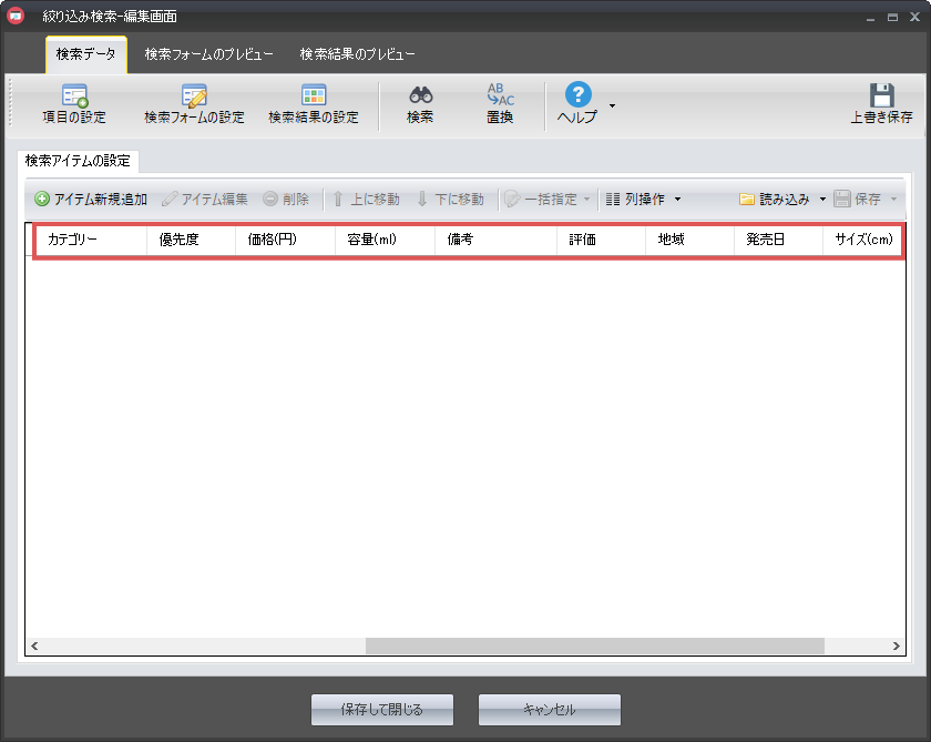 次に「検索アイテム」を追加し、商品等のデータベースを作成していきましょう。