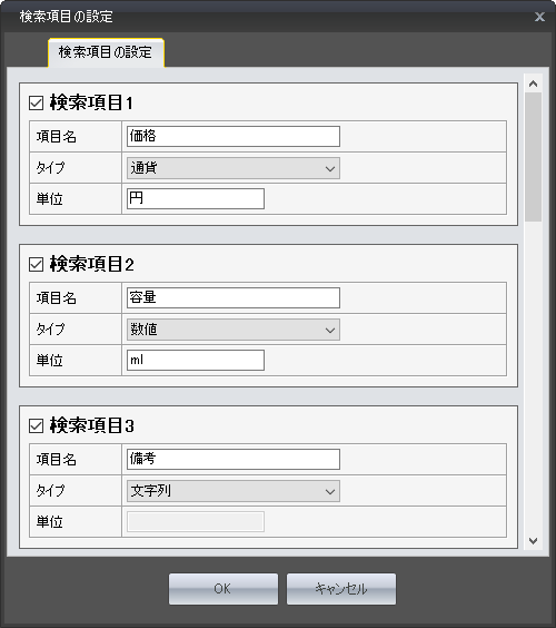 下図のように検索項目1〜10に項目名、タイプ、単位をそれぞれ設定することで