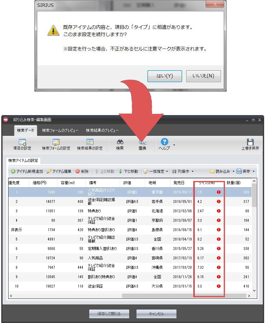 上記は「数値(小数点)」が設定されていたサイズの項目を「数値」に変更した例です。小数点が含まれているアイテムに注意マークが表示されています。
