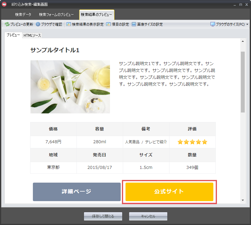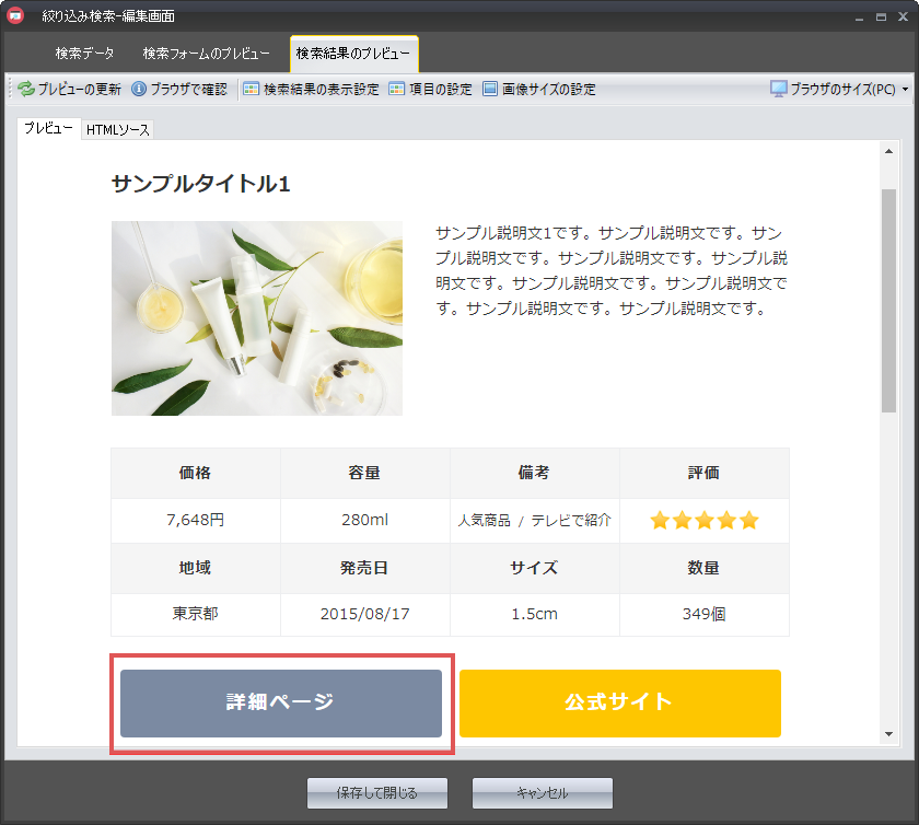 検索結果ページの「詳細ページ」ボタンにリンクされるサイトURLを入力します。
