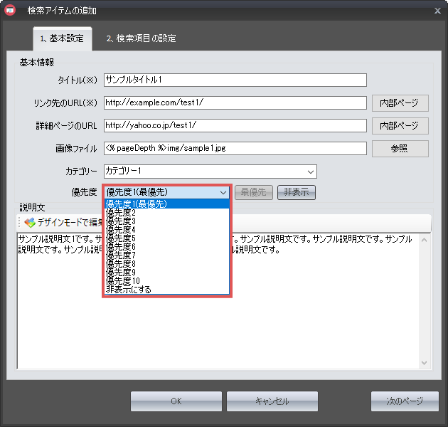 検索結果を表示した際の表示順の優先度を設定します。