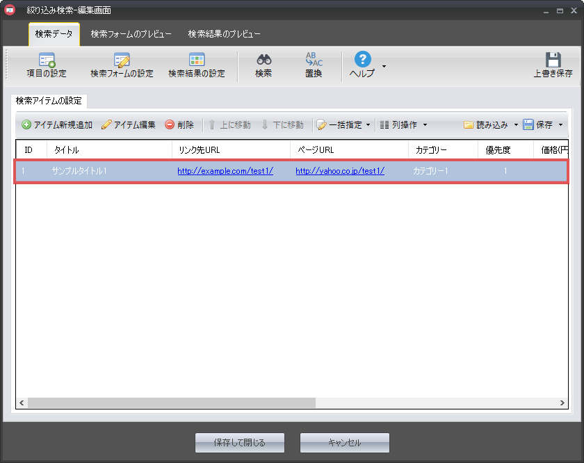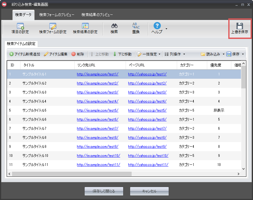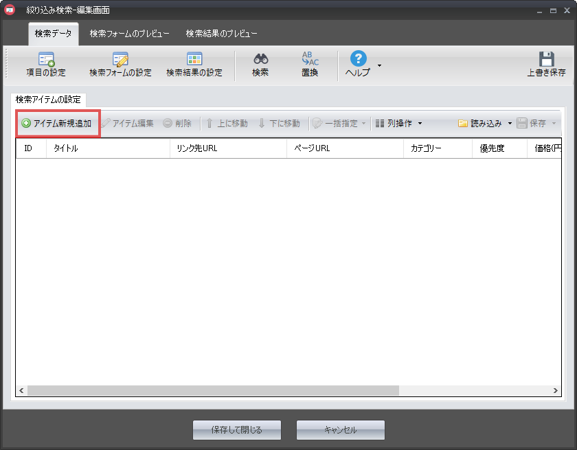 「せっかく検索アイテムを追加したのに、うっかりPCの電源を落としてしまった」という状況にならないよう、ある程度アイテムの追加を行った段階で「上書き保存」ボタンをクリックすることをお勧めします。