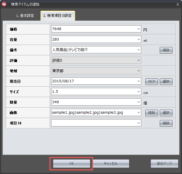 基本設定が完了したら、アイテムの検索項目設定を行います。