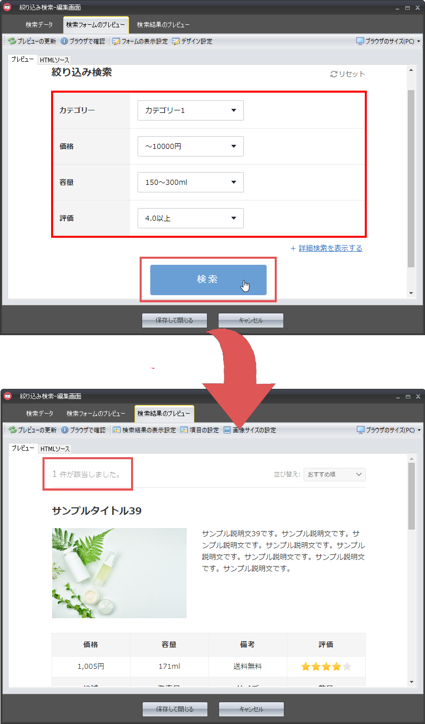 検索フォームのプレビュー、または検索結果のプレビューの下部に表示されている検索フォームから、実際に絞り込み検索を行うことができます。