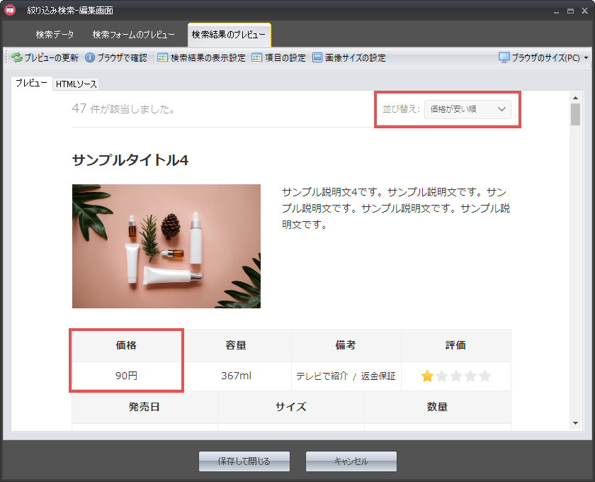 検索アイテム編集画面上部の「検索結果のプレビュー」を選択してください。