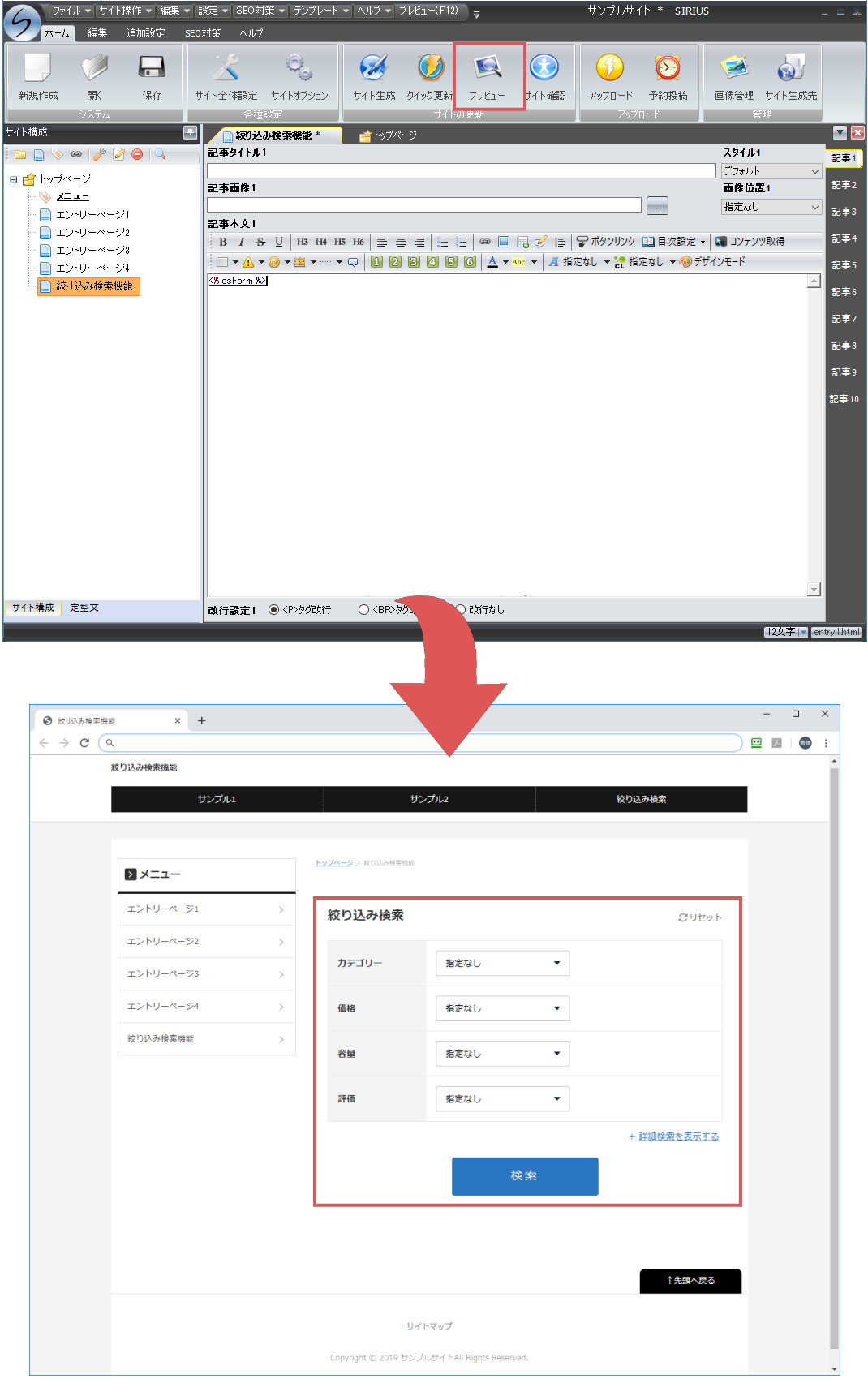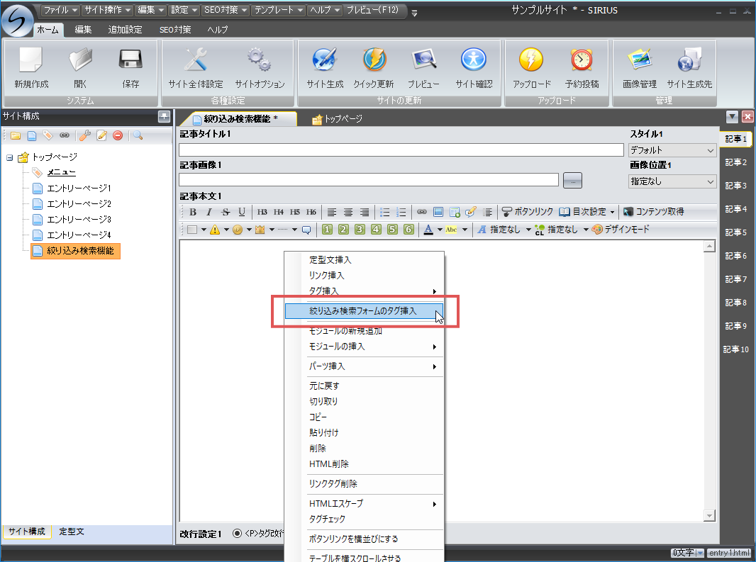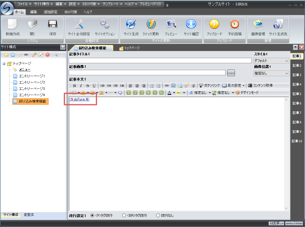 後はSIRIUSの記事本文内等に、検索フォームの独自タグを挿入するのみです。