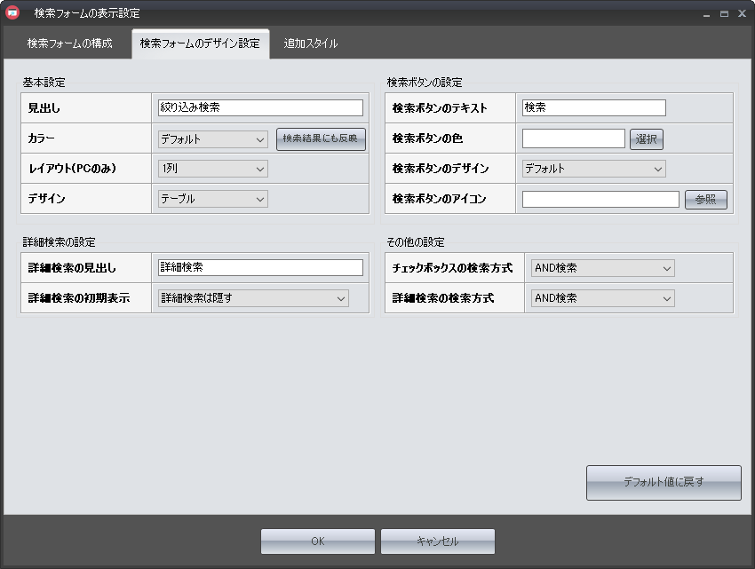 検索フォーム設定画面の『デザイン設定』の項目で設定を行う事で、