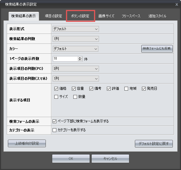 「検索結果の表示設定」画面上の『ボタンの設定』タブを選択してください。
