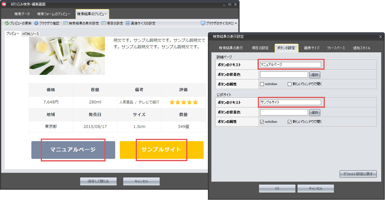 検索アイテムの「詳細ページ」、「公式サイト」のボタンテキストが変更できます。