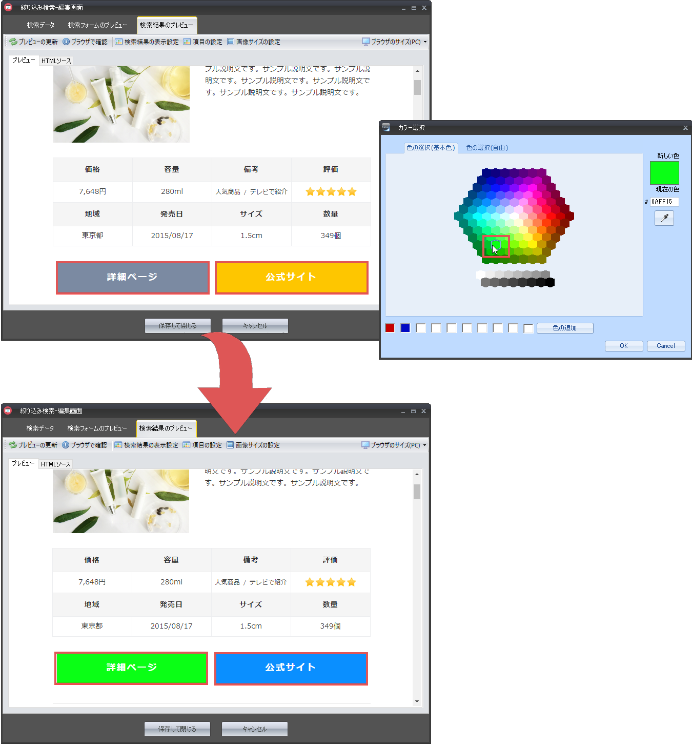 検索アイテムの「詳細ページ」、「公式ページ」のボタン背景色が変更できます。