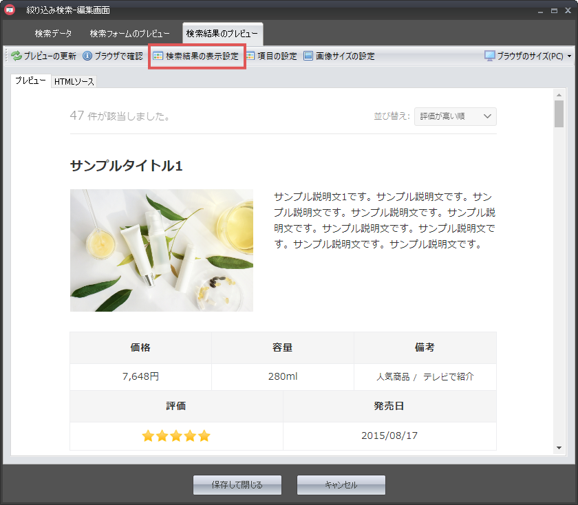 プレビュー画面の上部にある「検索結果の表示設定」ボタンを選択してください。
