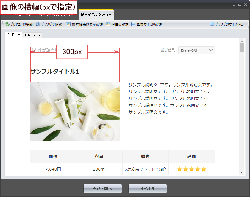例えばこちらで300pxと指定した場合、全ての検索アイテムのサムネイル画像が300pxの横幅となります。